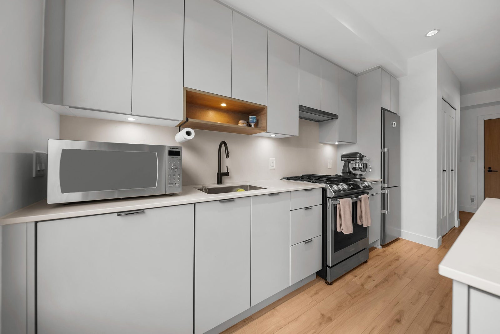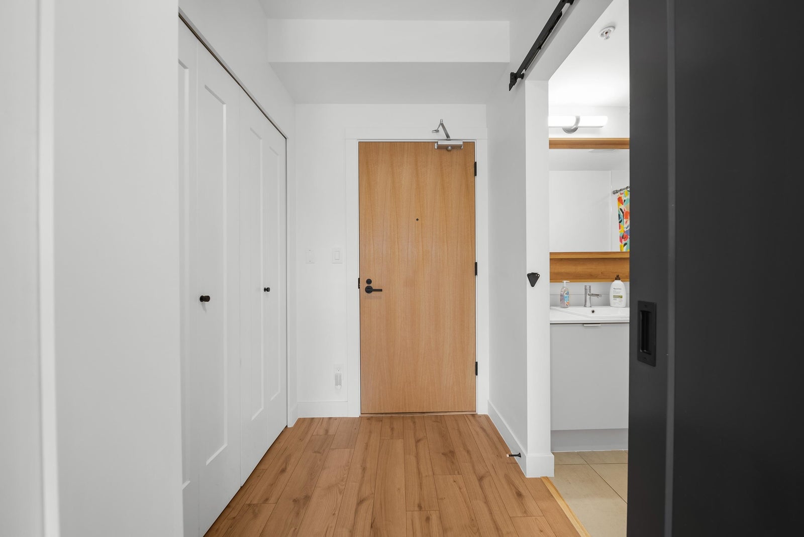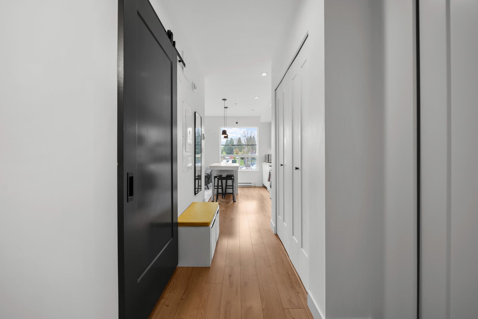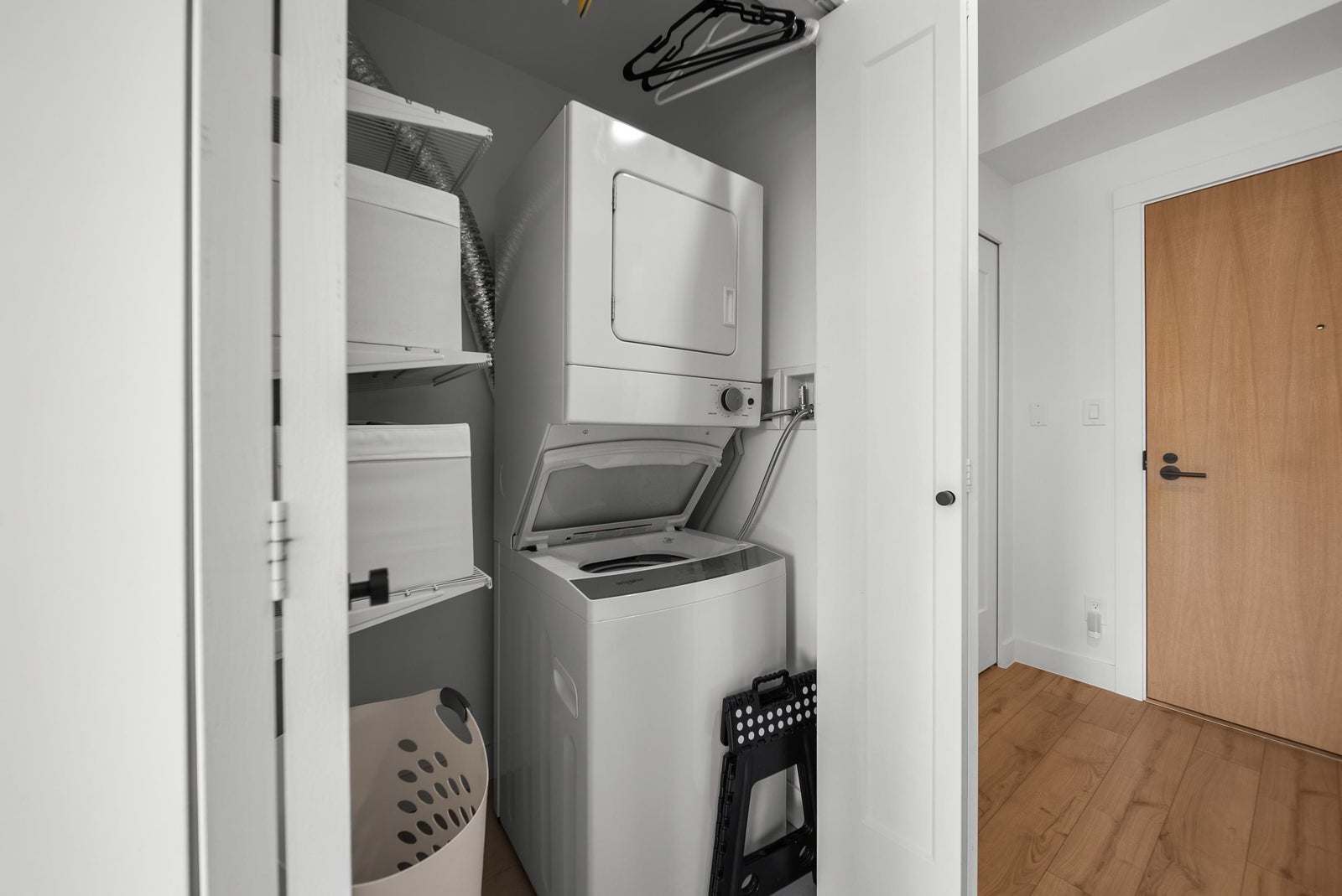 Welcome to Upper Montrose at 2493 Montrose Ave in historic downtown Abbotsford! This modern junior 1-bedroom features wide plank flooring, contemporary cabinetry, quartz countertops, and a premium appliance package with gas range. Functional layout with sliding glass wall for bedroom privacy, stunning 4-piece bath, barn door detail, and built-in split A/C. Includes in-suite laundry, storage, 1 underground parking stall, and storage locker. Enjoy a vibrant, walkable lifestyle just steps to Old Yale Brewing, cafes, boutiques, restaurants, and the farmers market. Building offers courtyard and playground area. Easy access to Hwy 1 and UFV. Open house May 2 1-3pm